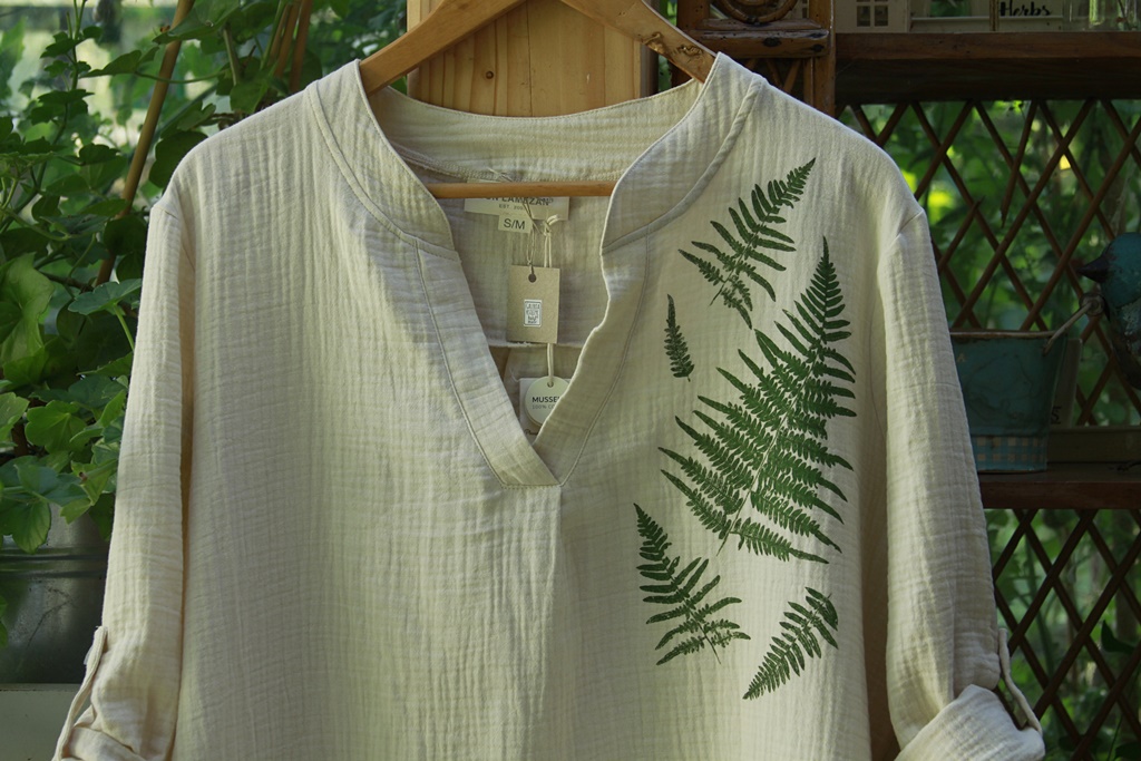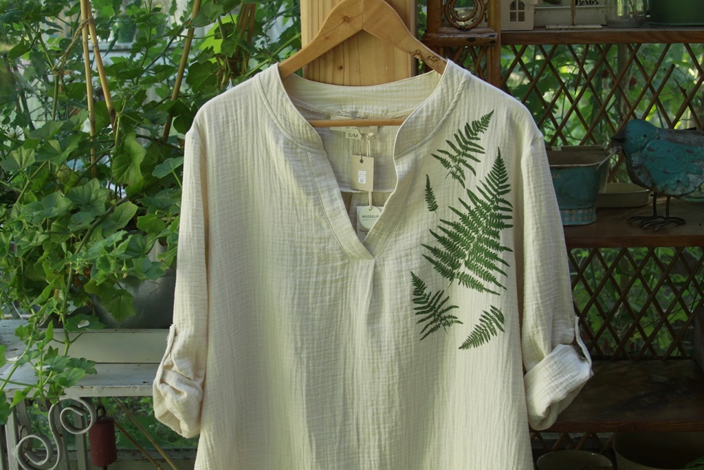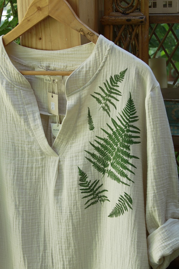Stemple roślinne wykonane ręcznie nietoksycznymi akrylami do tkanin i utrwalone termicznie.