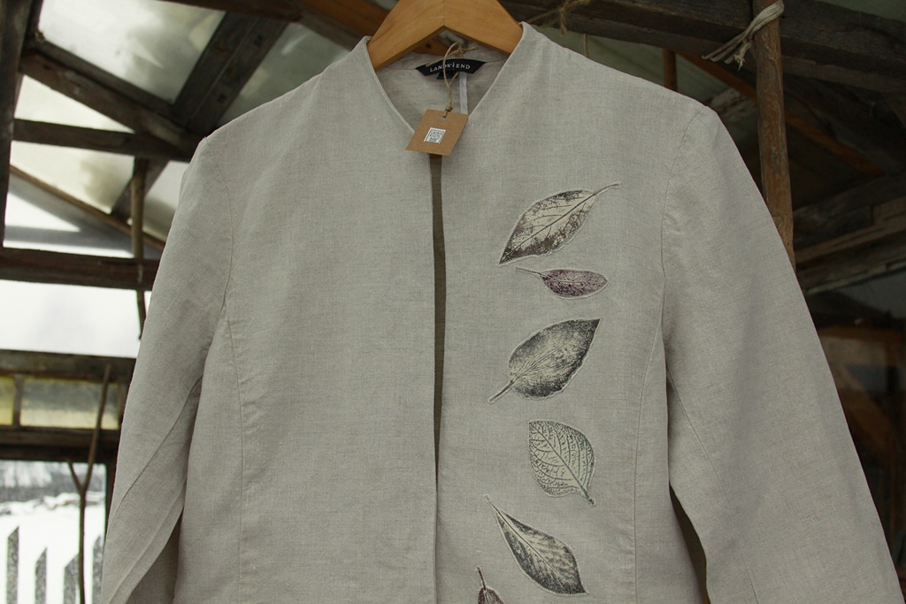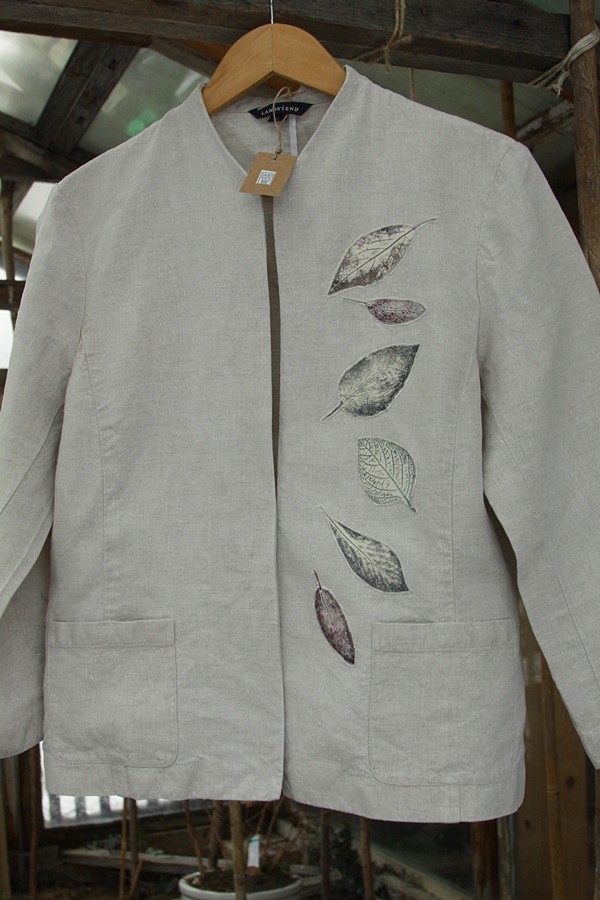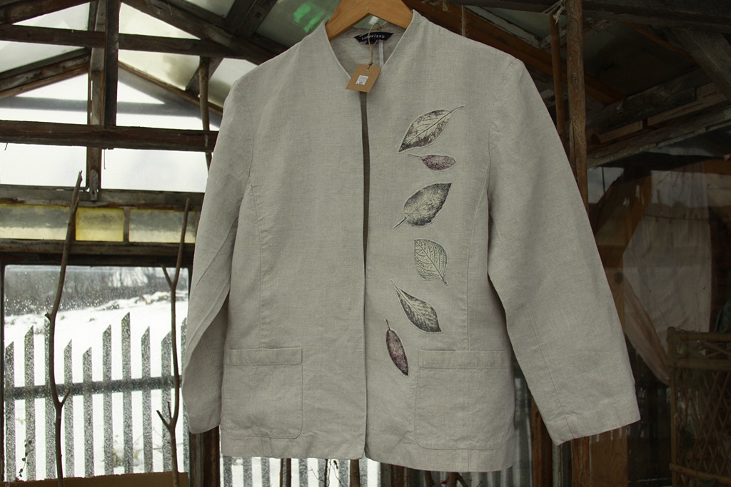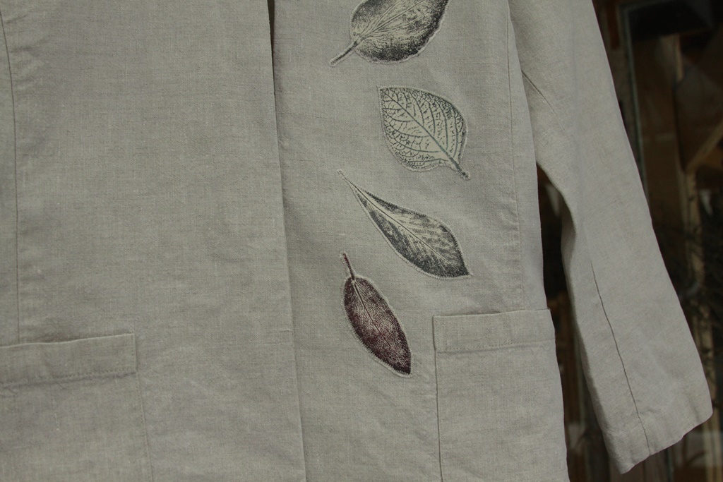 Stemple liści wykonane ręcznie nietoksycznymi akrylami do tkanin i utrwalone termicznie.