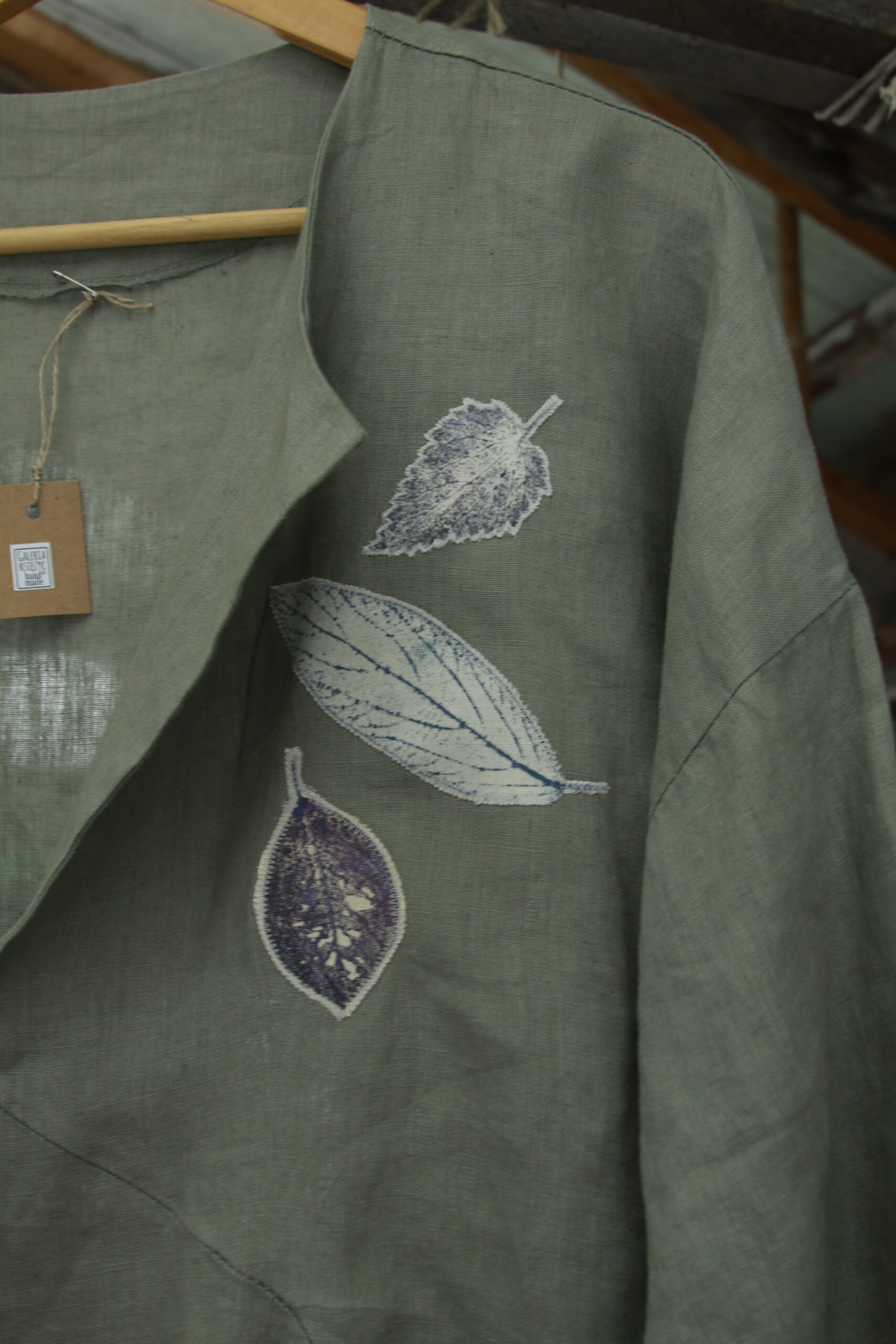 Stemple liści wykonane ręcznie nietoksycznymi akrylami do tkanin i utrwalone termicznie.