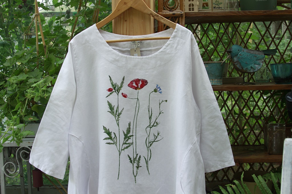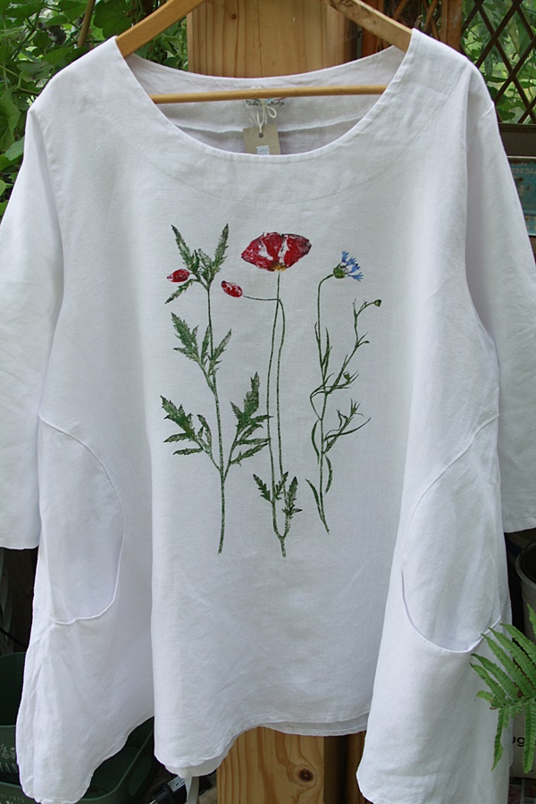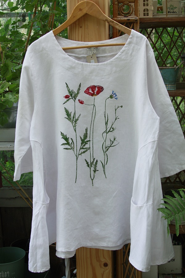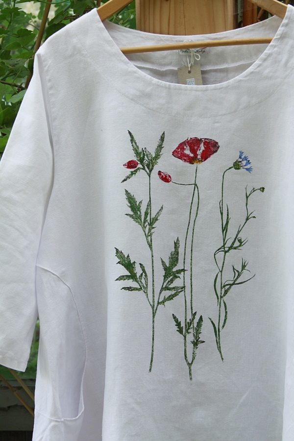 Stemple roślinne wykonane ręcznie nietoksycznymi akrylami do tkanin i utrwalone termicznie.