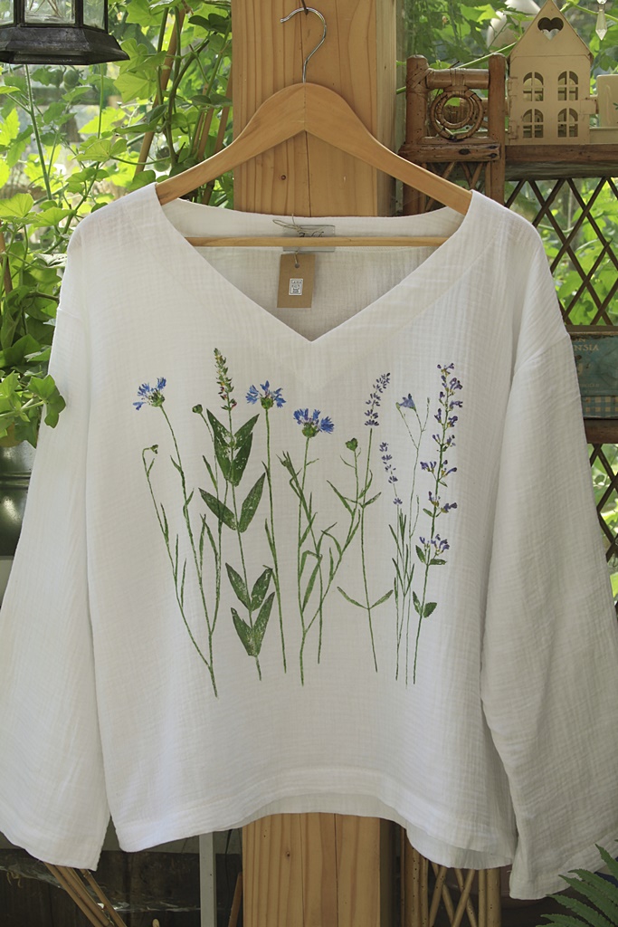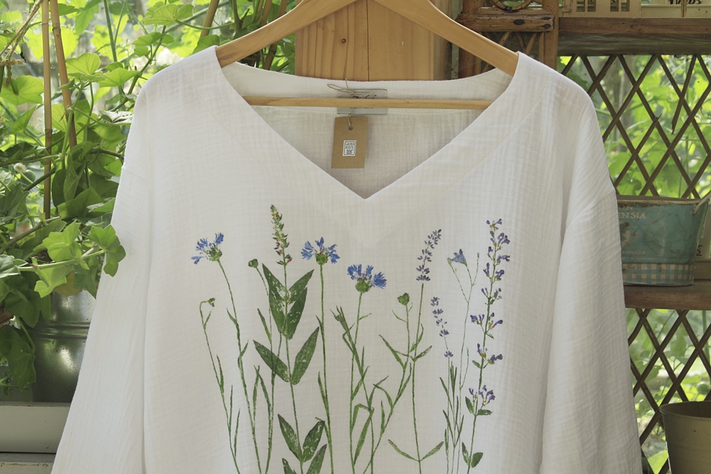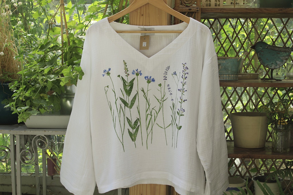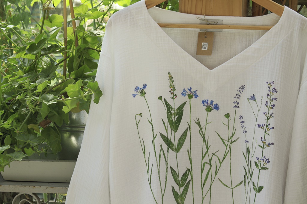 Stemple roślinne wykonane ręcznie nietoksycznymi akrylami do tkanin i utrwalone termicznie.