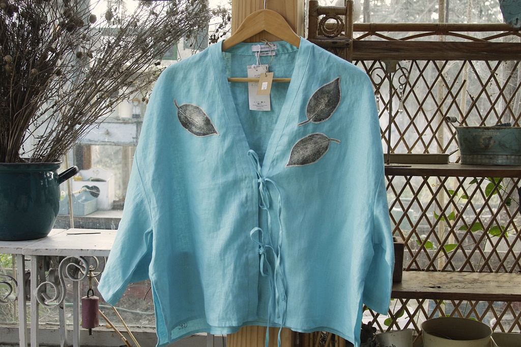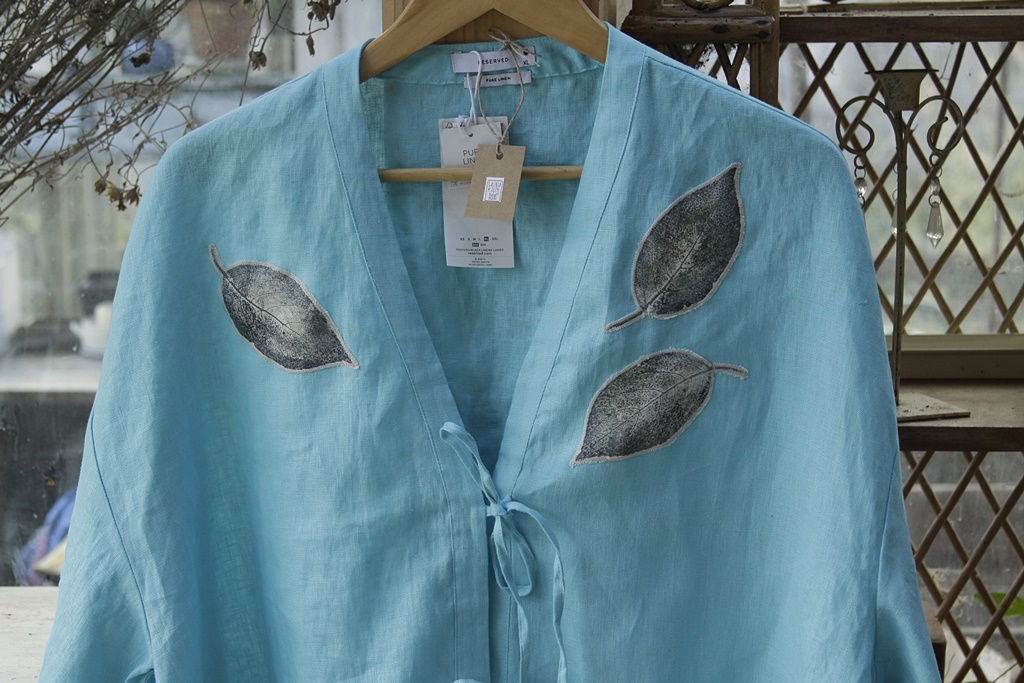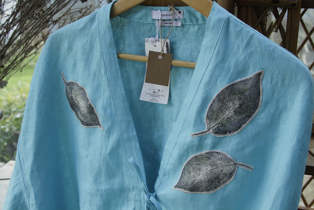 Stemple liści wykonane ręcznie nietoksycznymi akrylami do tkanin i utrwalone termicznie.