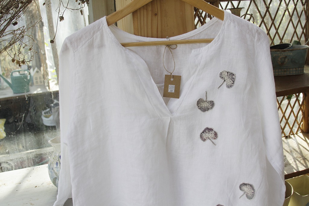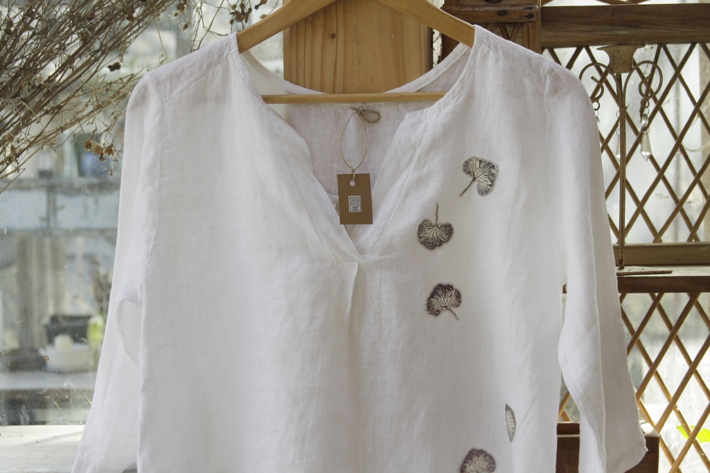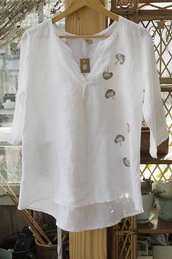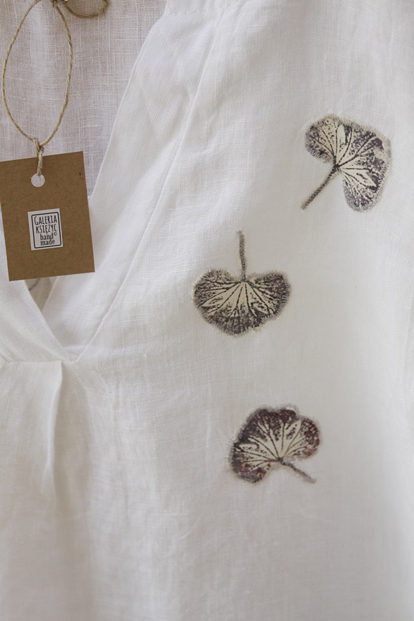 Stemple liści wykonane ręcznie nietoksycznymi akrylami do tkanin i utrwalone termicznie.